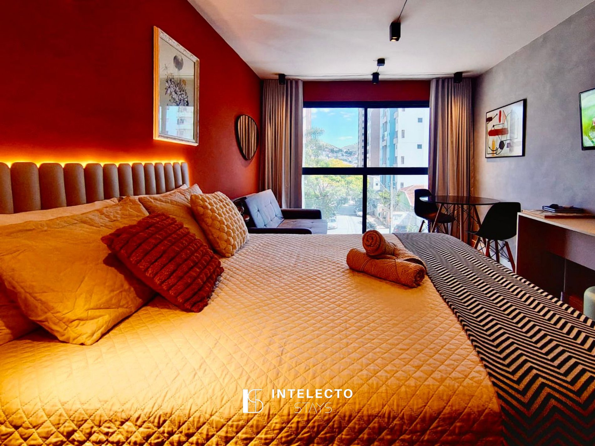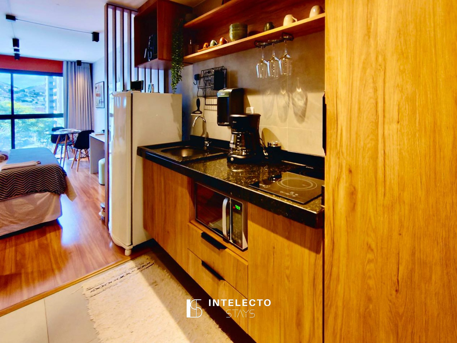 - Espaços integrados (quarto com cama queen e sala de estar com sofá-cama) com armários e guarda-roupas planejados