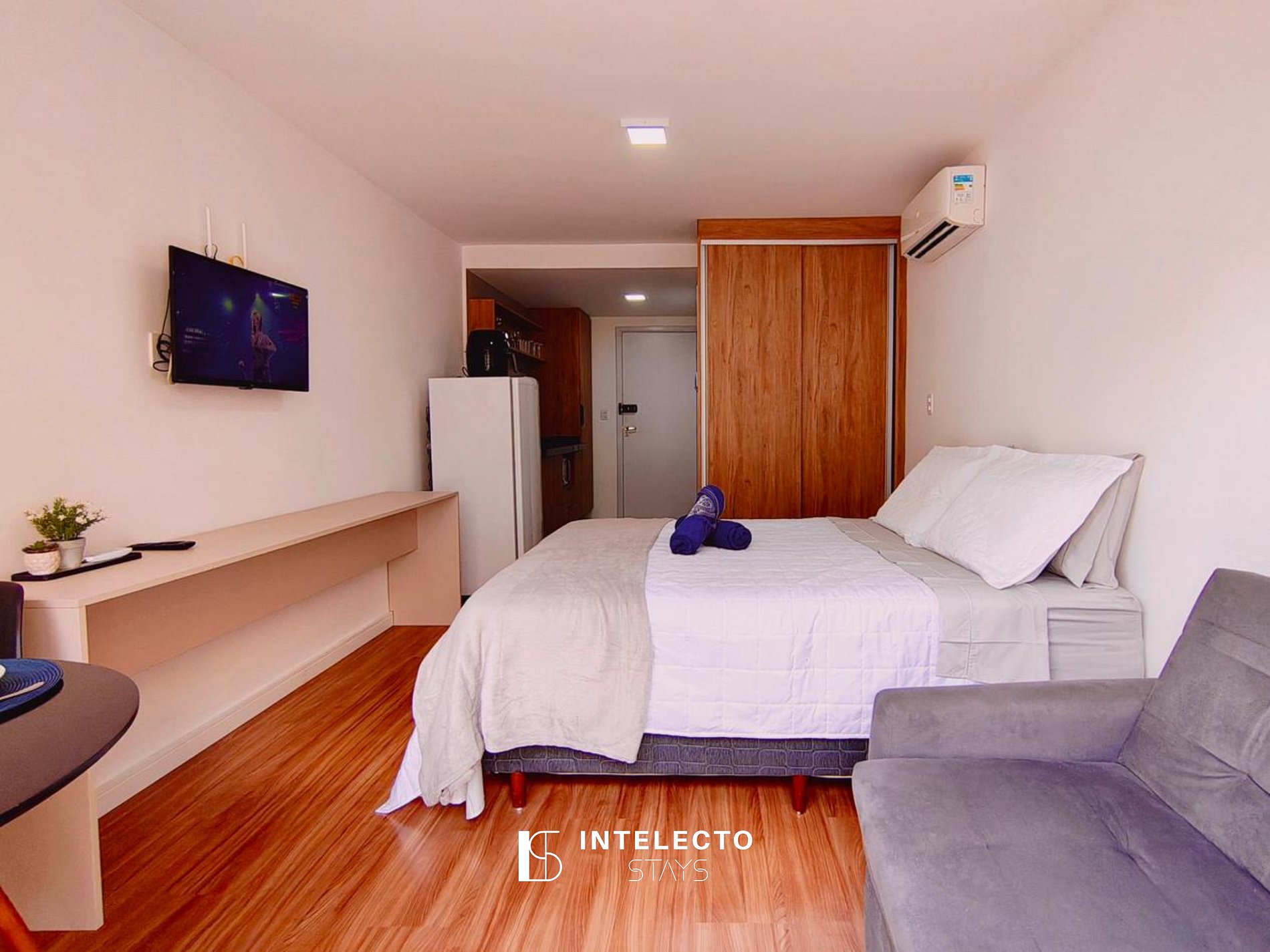 - Espaços integrados (quarto com cama queen e sala de estar com sofá-cama) com armários e guarda-roupas planejados