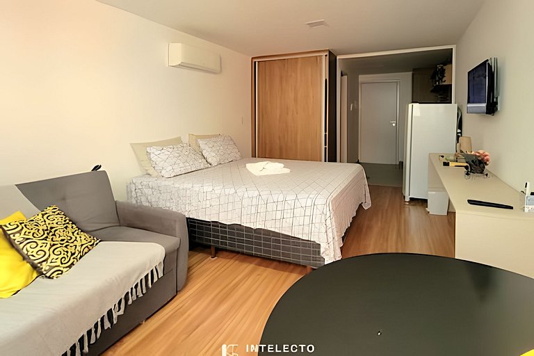 - Espaços integrados (quarto com cama queen e sala de estar com sofá-cama) com armários e guarda-roupas planejados