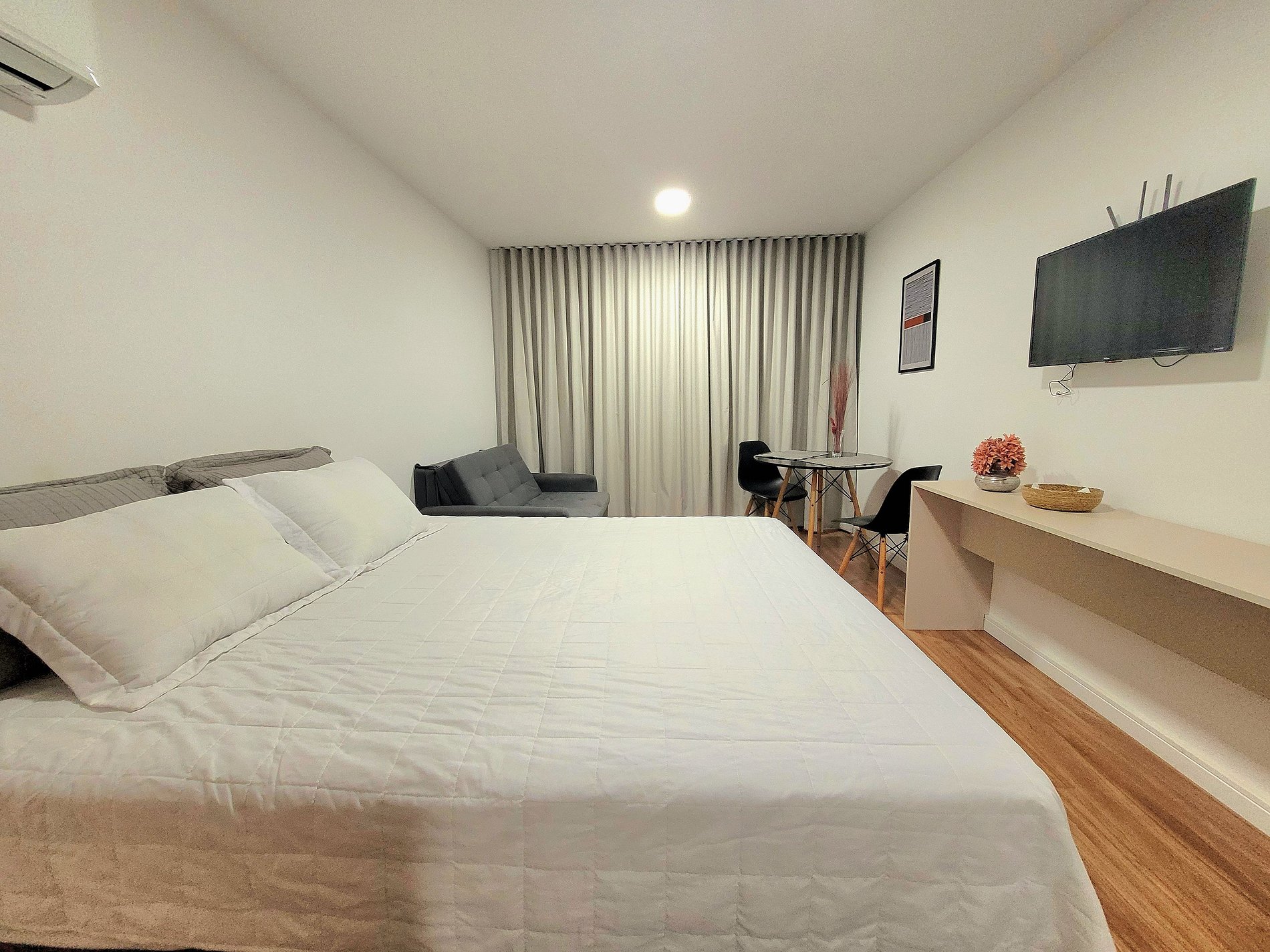 - Espaços integrados (quarto com cama queen e sala de estar com sofá-cama) com armários e guarda-roupas planejados