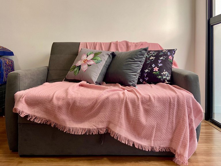 - Espaços integrados (quarto com cama queen e sala de estar com sofá-cama) com armários e guarda-roupas planejados