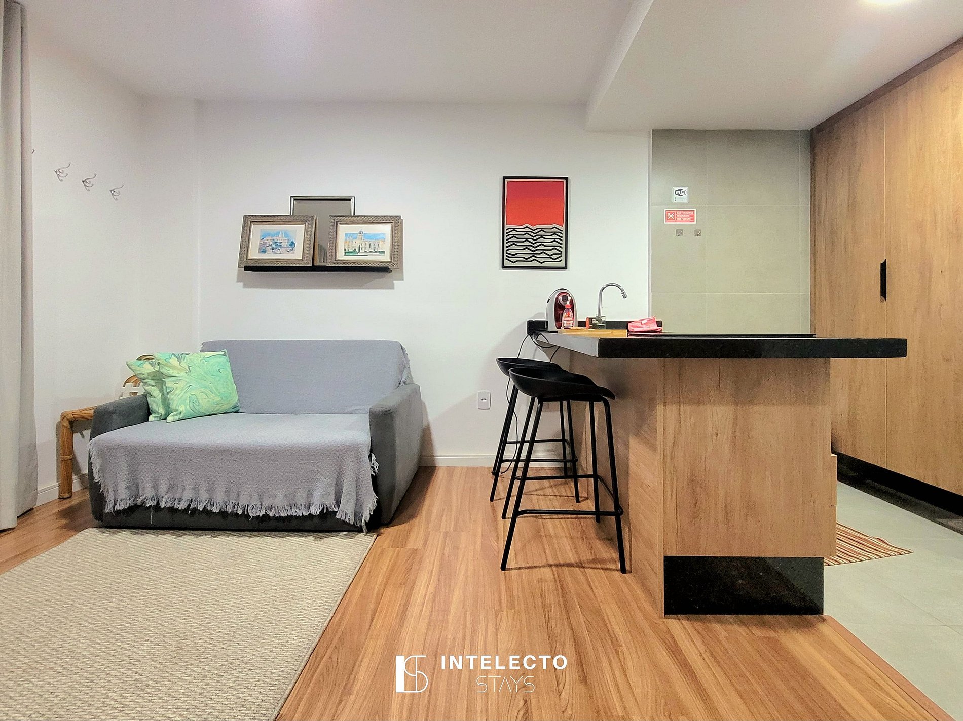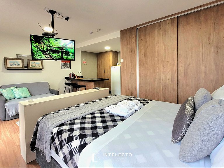 - Espaços integrados (quarto com cama queen e sala de estar com sofá-cama) com armários e guarda-roupas planejados