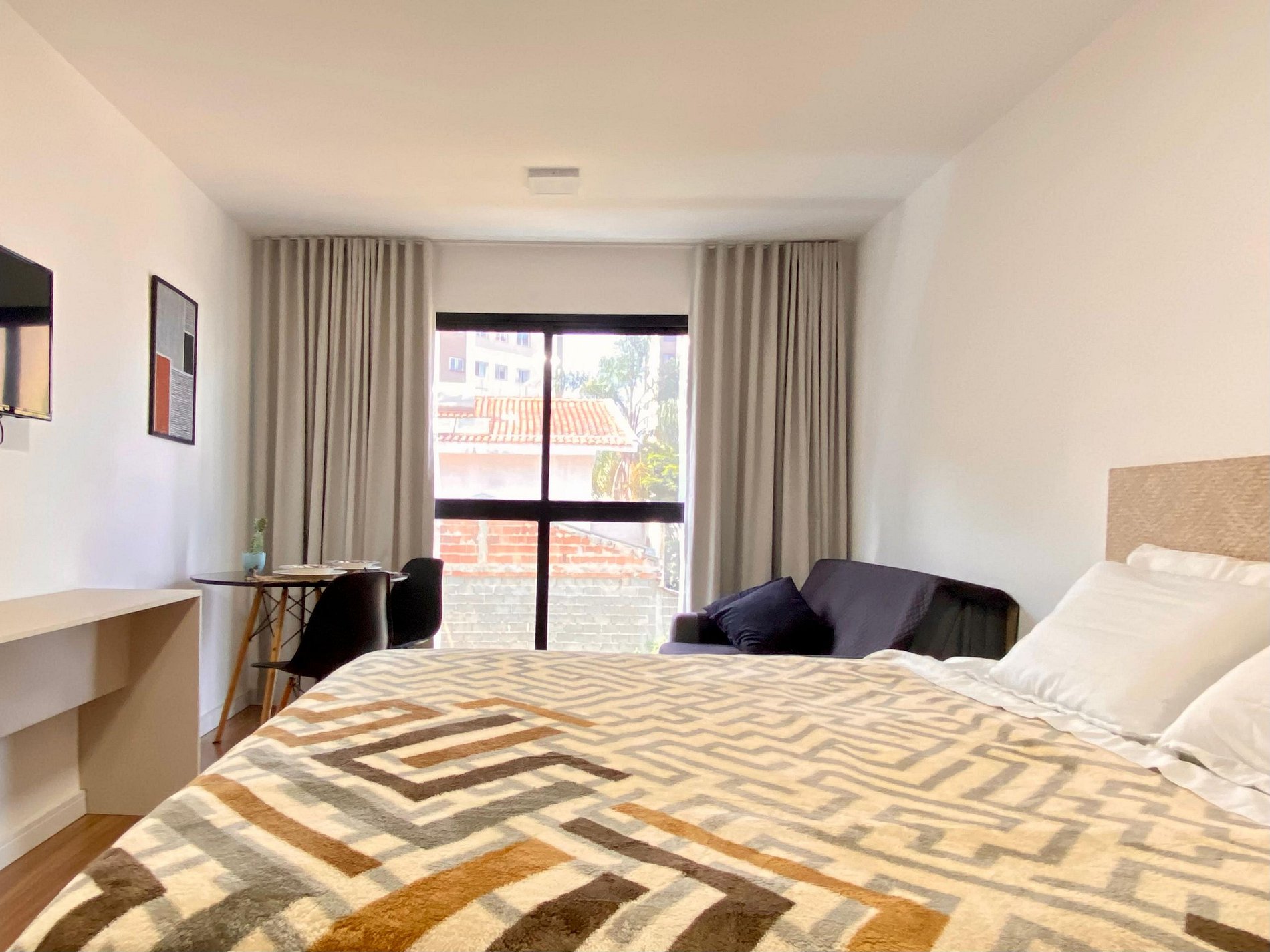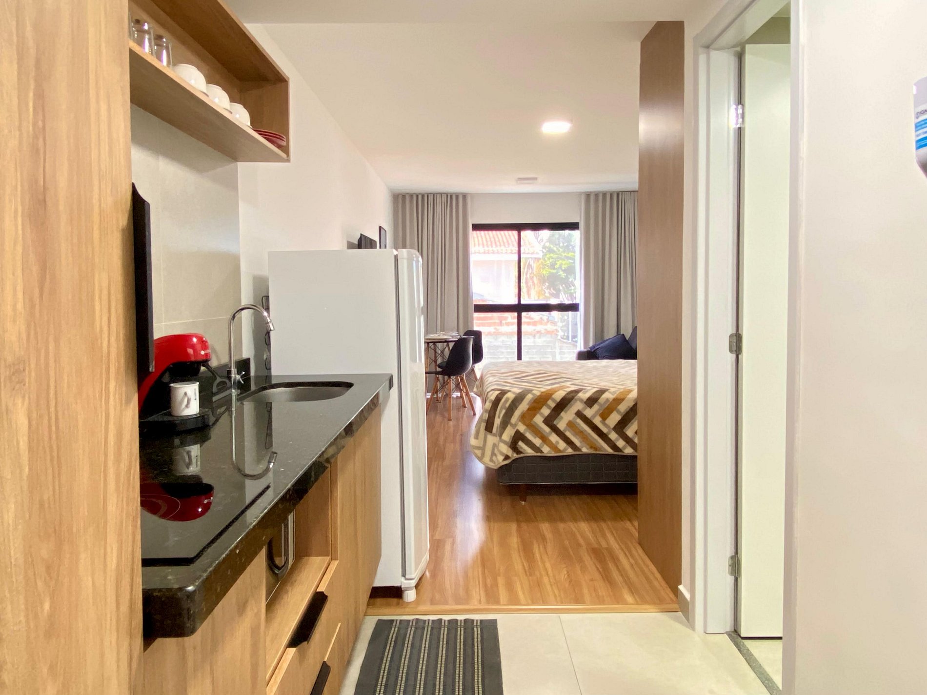 - Espaços integrados (quarto com cama queen e sala de estar com sofá-cama) com armários e guarda-roupas planejados