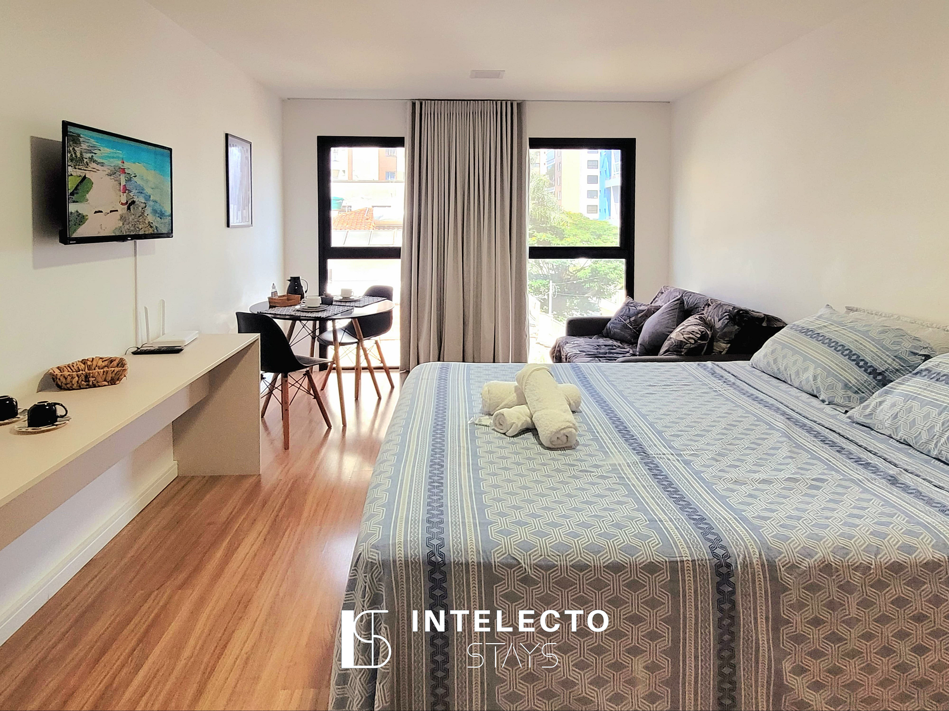 - Espaços integrados (quarto com cama queen e sala de estar com sofá-cama) com armários e guarda-roupas planejados