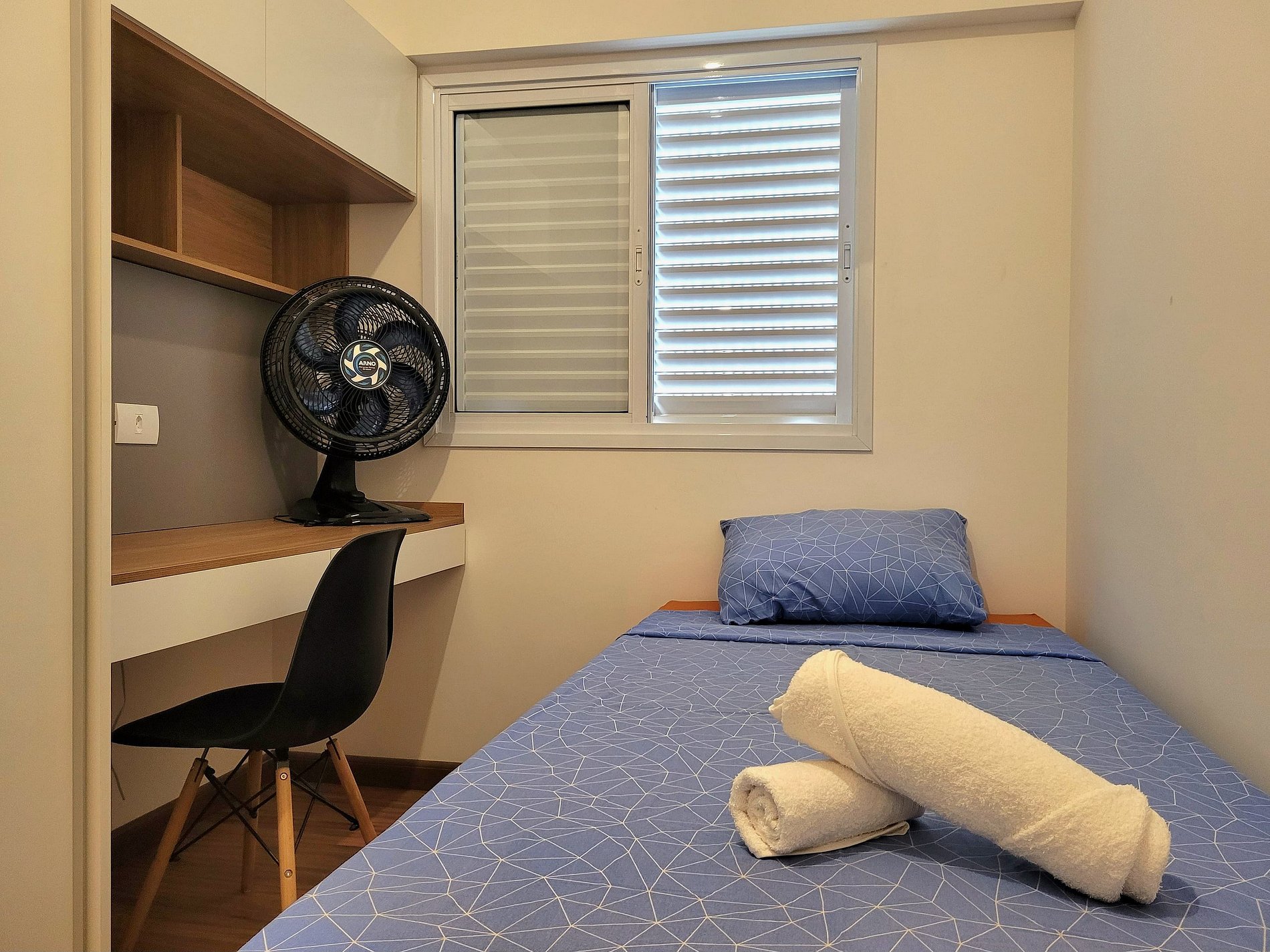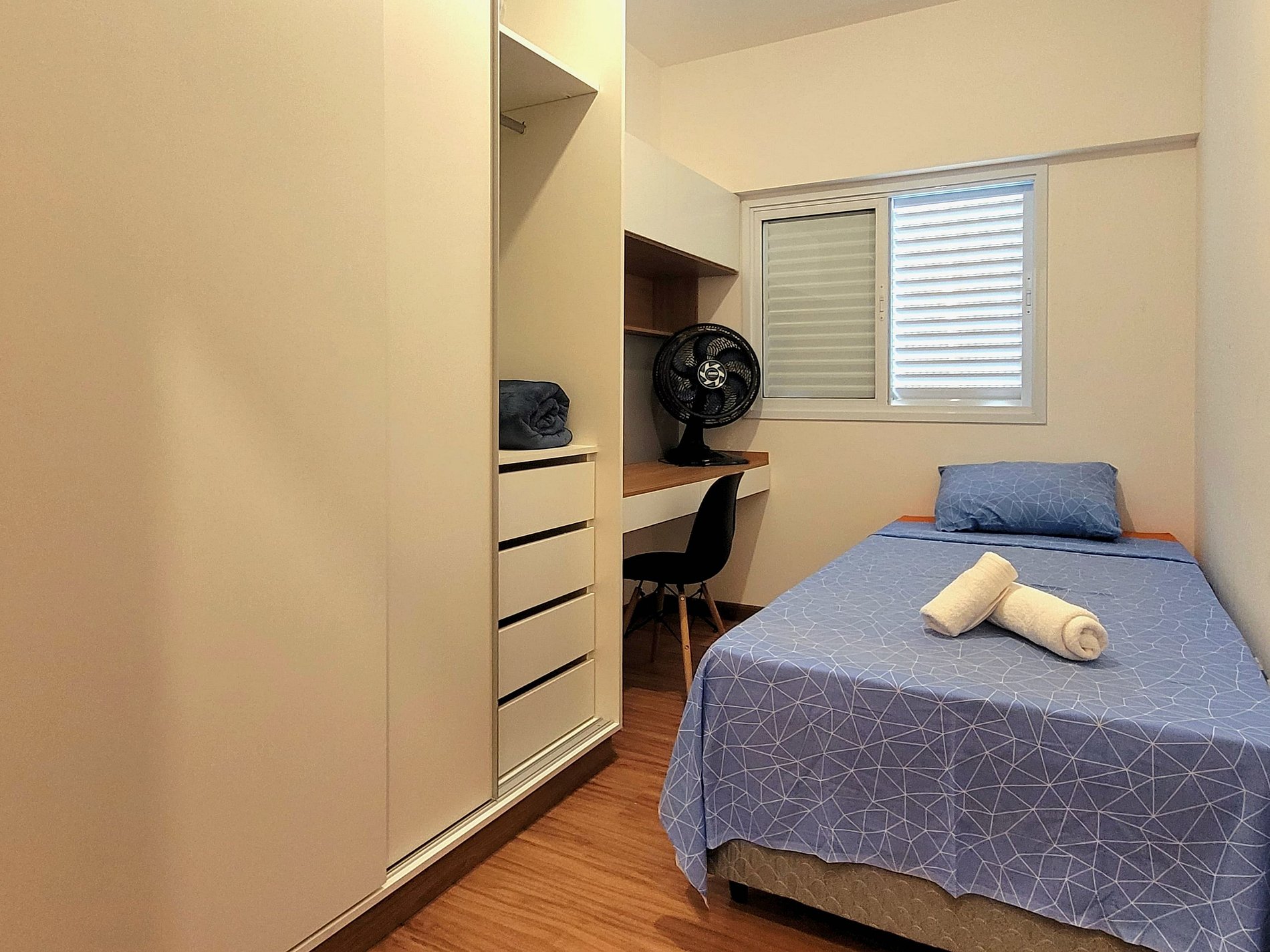 - Dois dormitórios (uma suíte com cama de casal e um quarto com uma cama de solteiro)