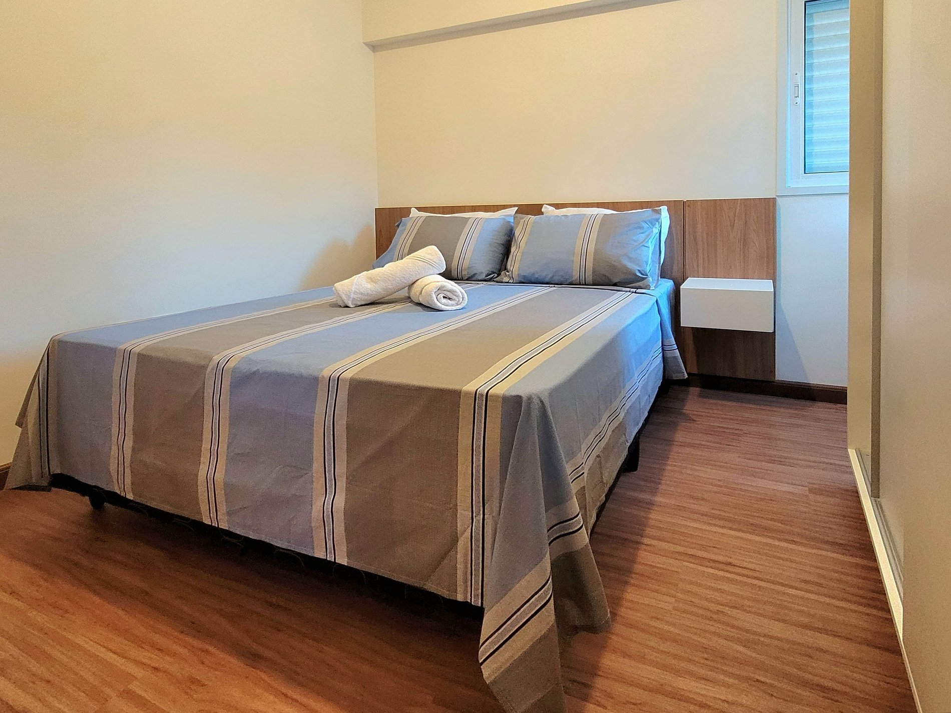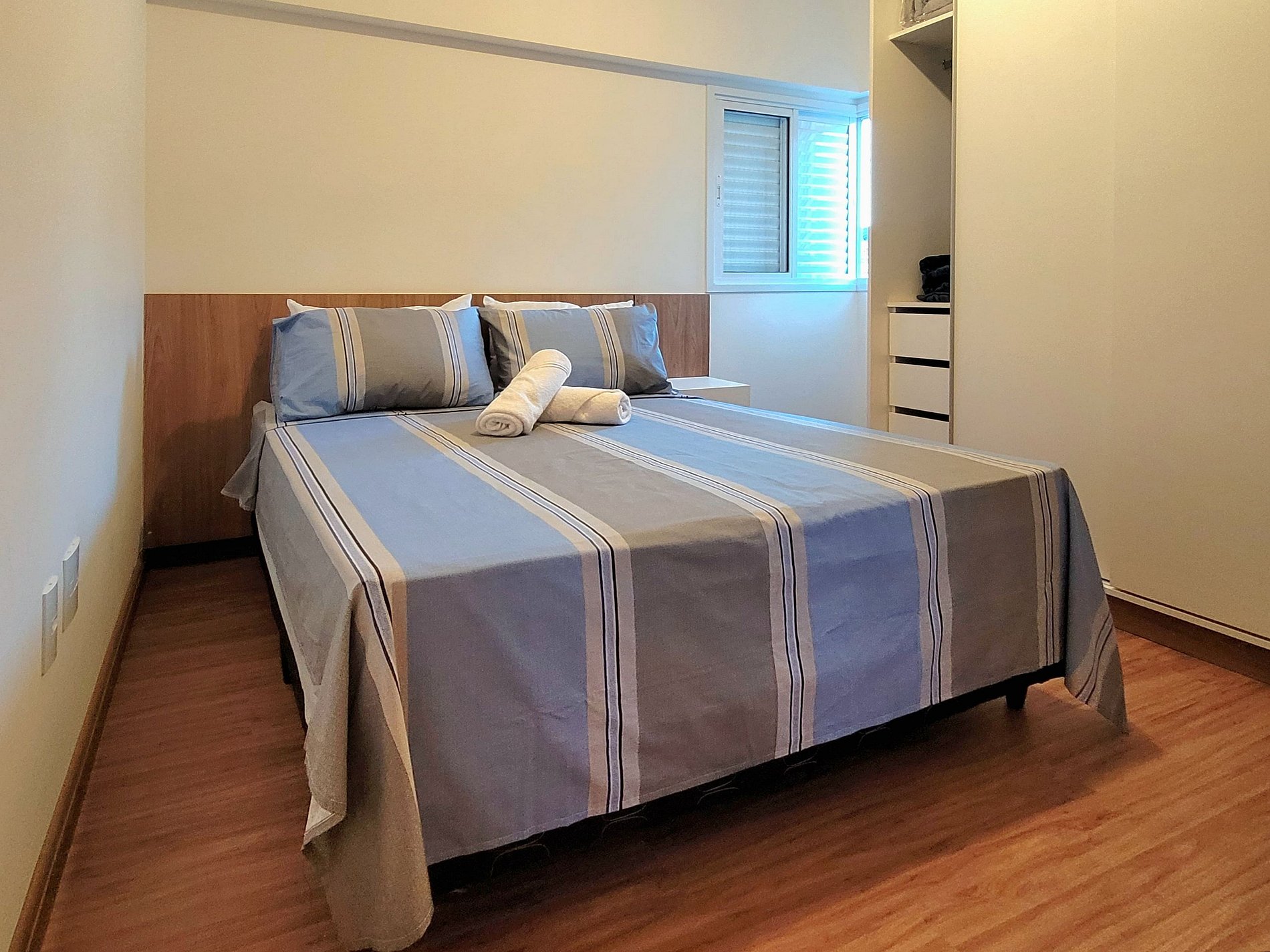 - Dois dormitórios (uma suíte com cama de casal e um quarto com uma cama de solteiro)