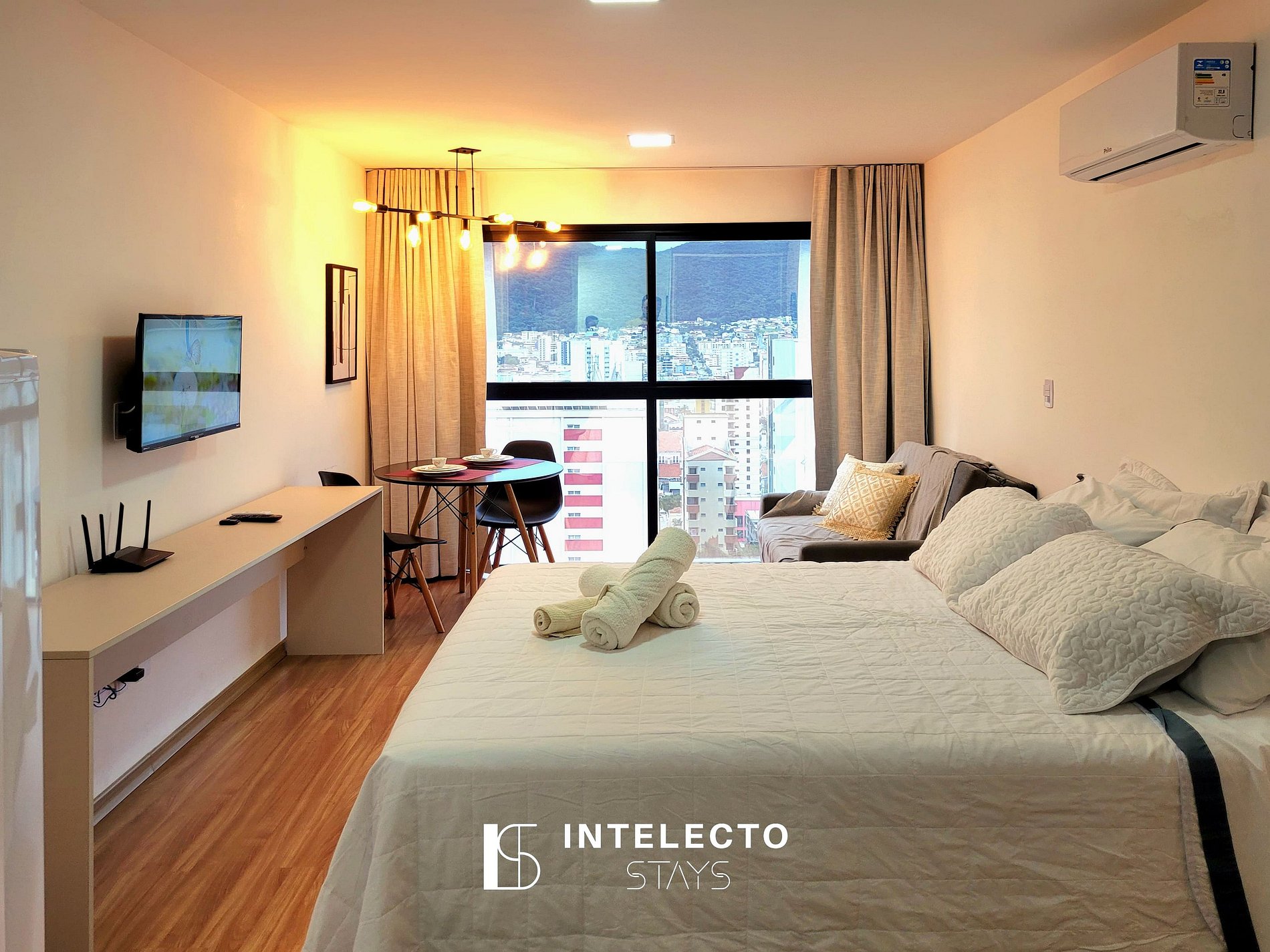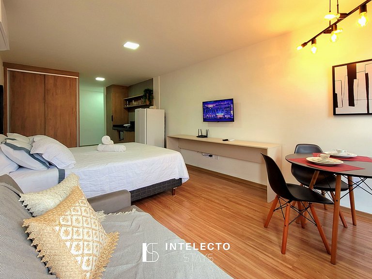 - Espaços integrados (quarto com cama queen e sala de estar com sofá-cama) com armários e guarda-roupas planejados
