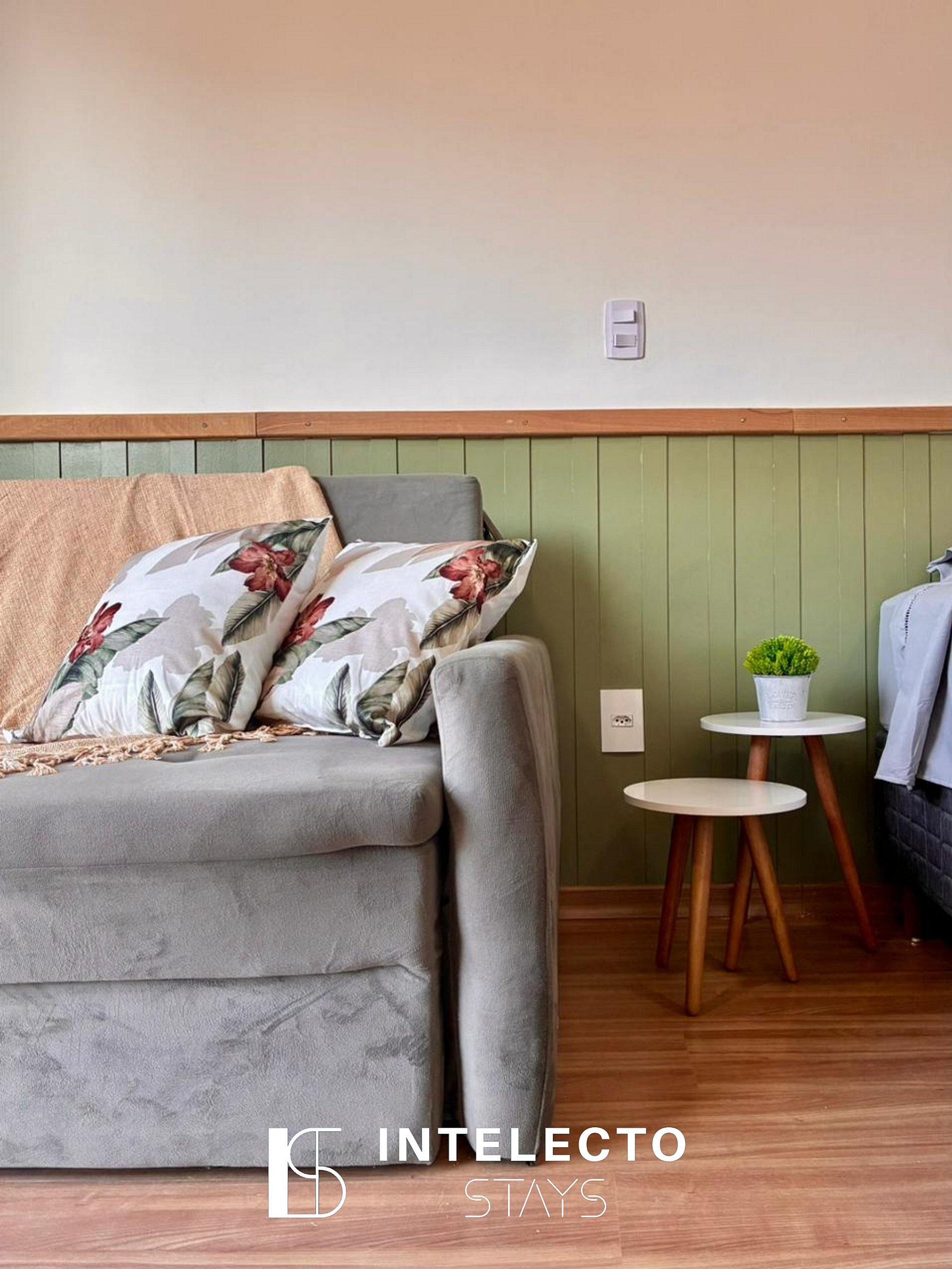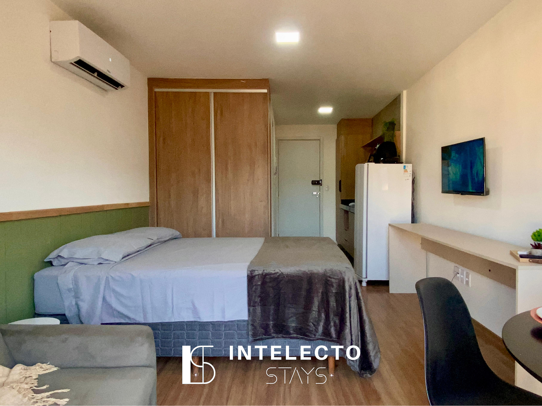- Espaços integrados (quarto com cama queen e sala de estar com sofá-cama) com armários e guarda-roupas planejados