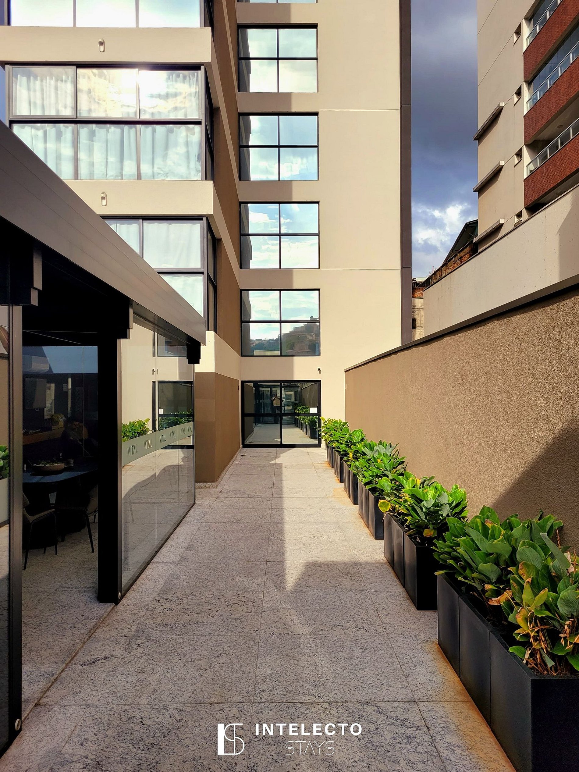 O condomínio está situado na área central de Poços, perto de tudo. É muito tranquilo, seguro e organizado, com portaria 24 horas, self check-in com reconhecimento facial e uma vista linda da cidade.
