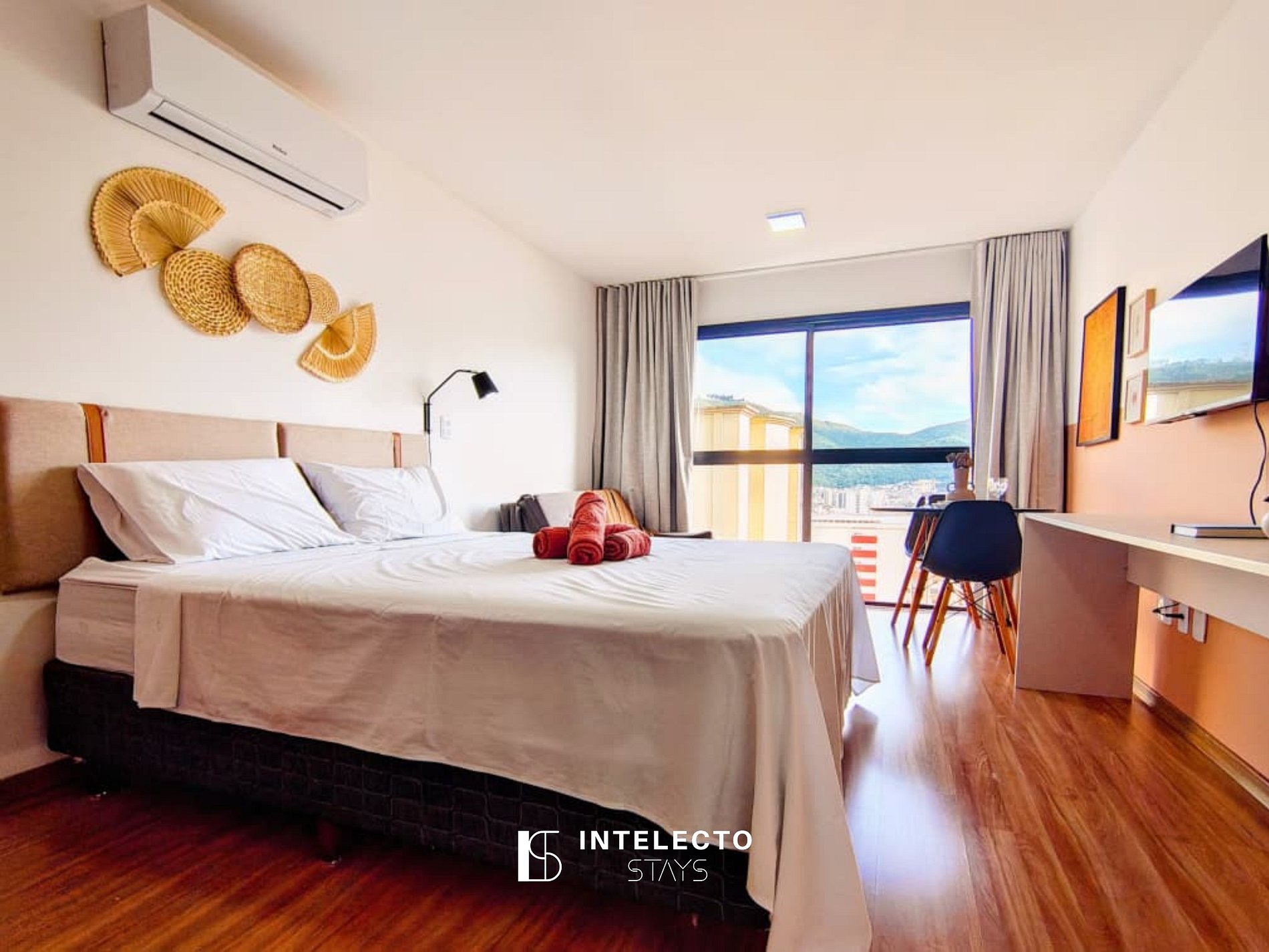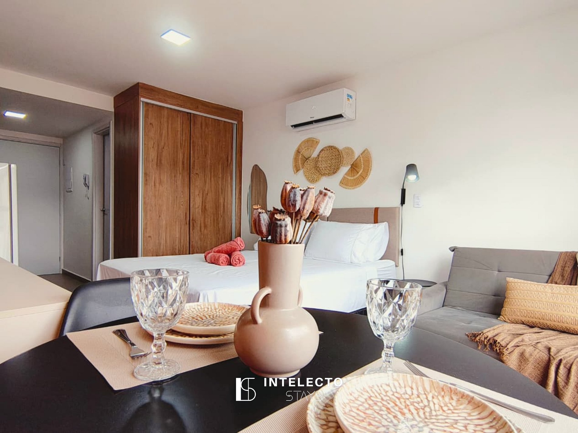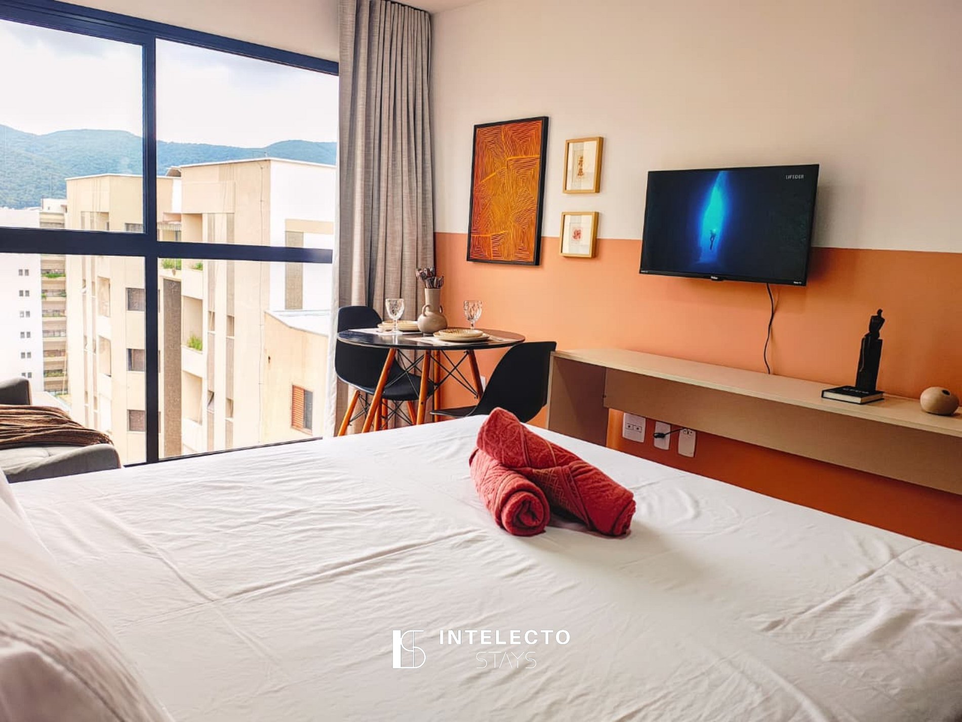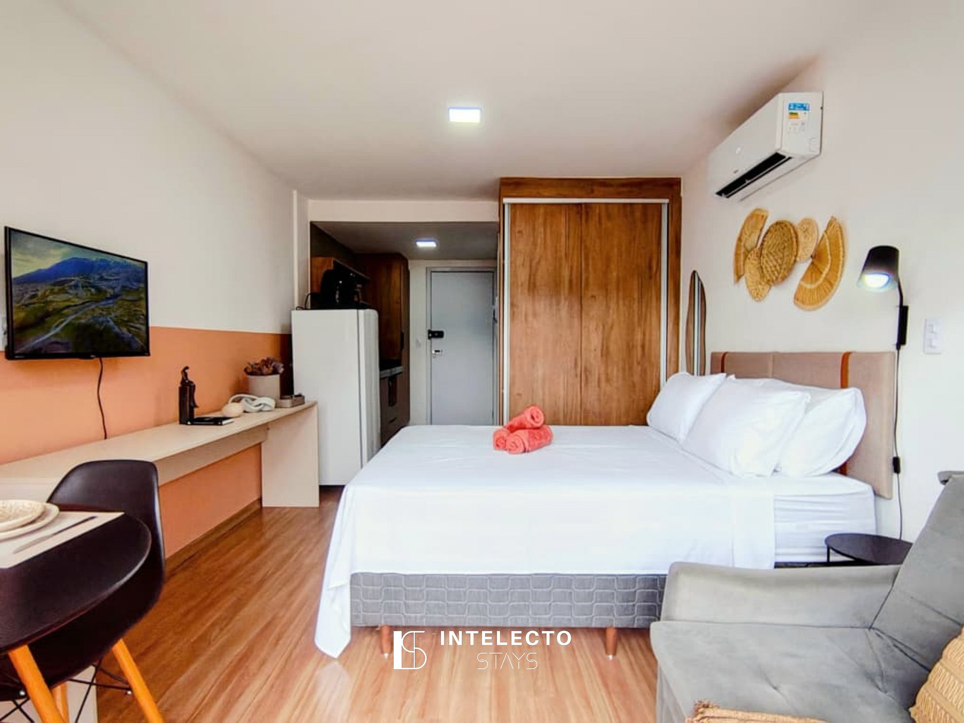 - Espaços integrados (quarto com cama queen e sala de estar com sofá-cama) com armários e guarda-roupas planejados