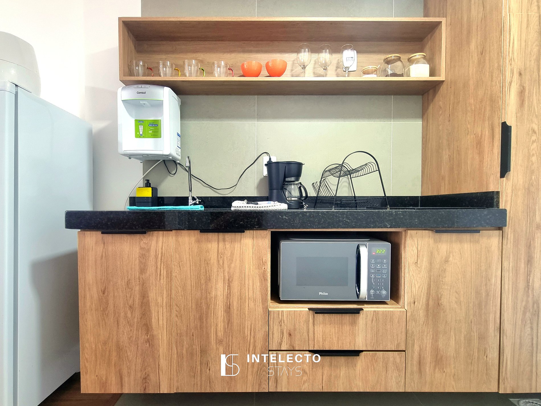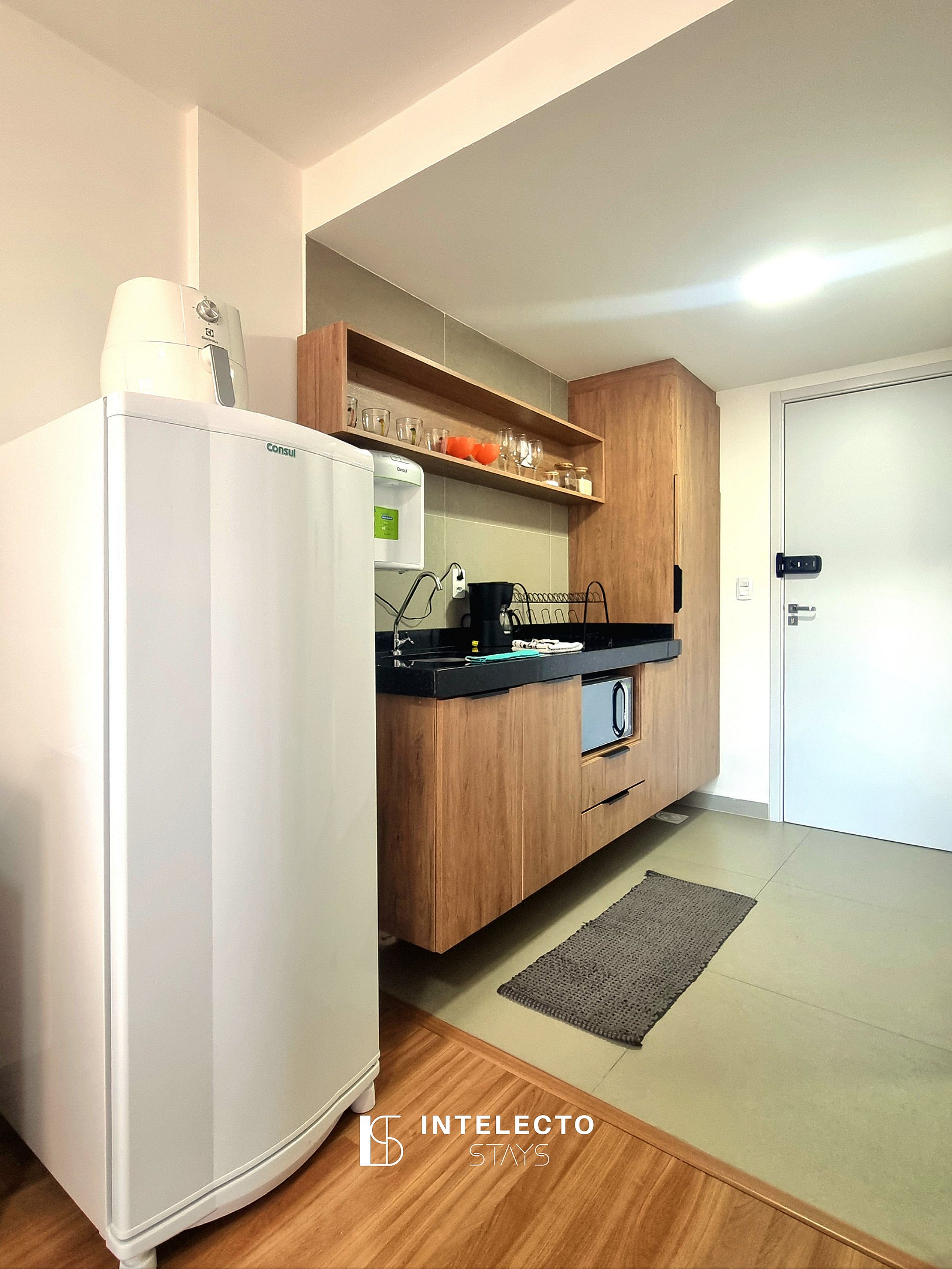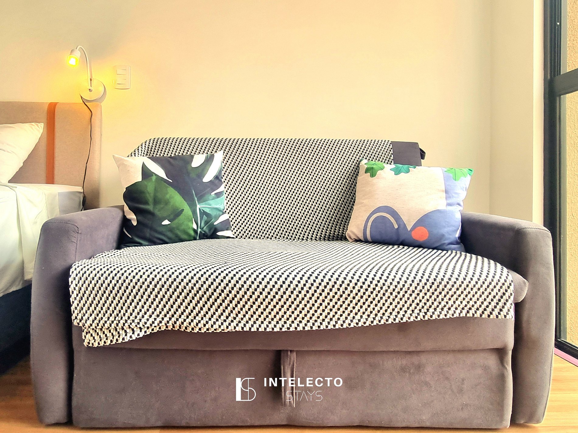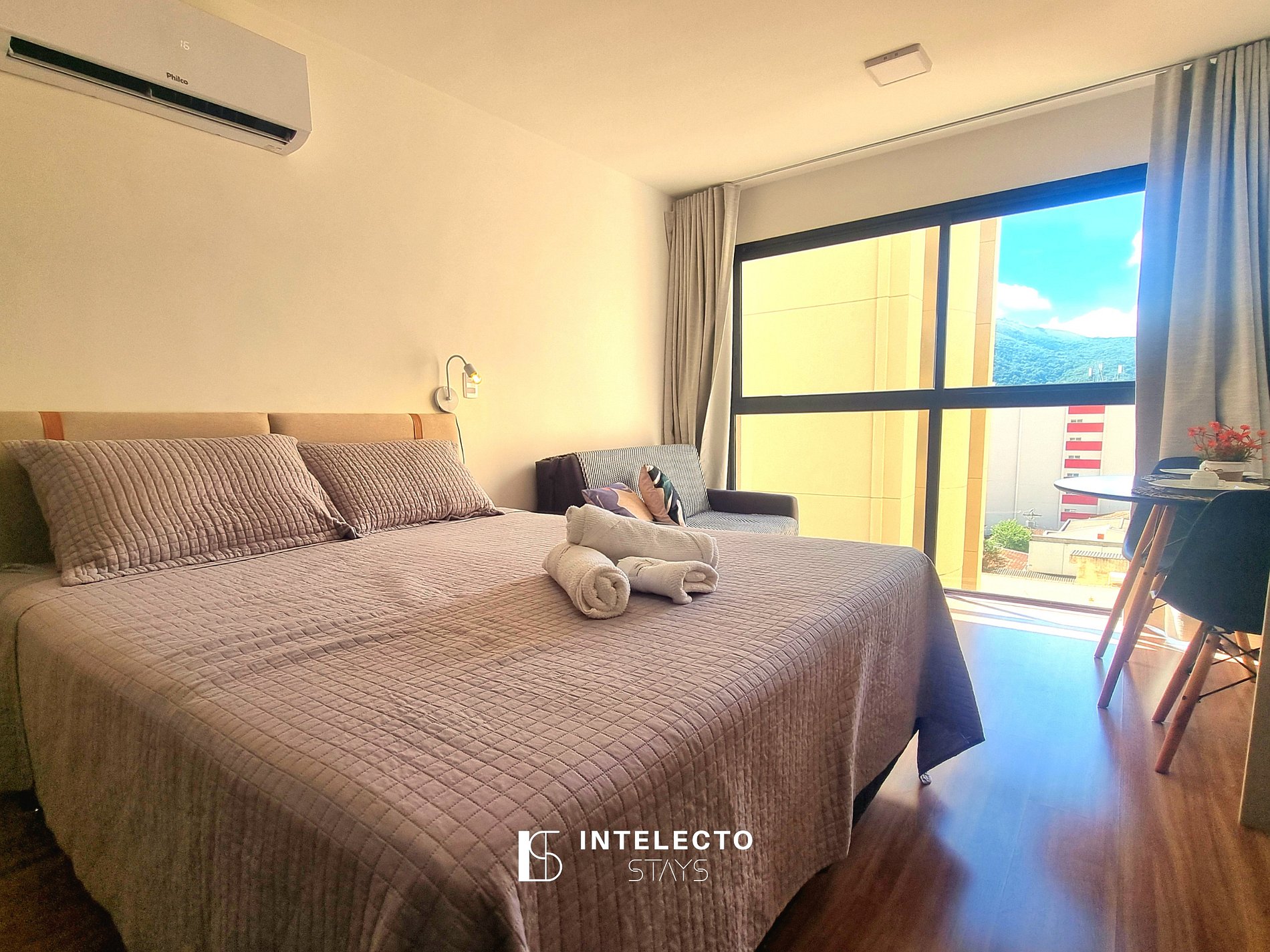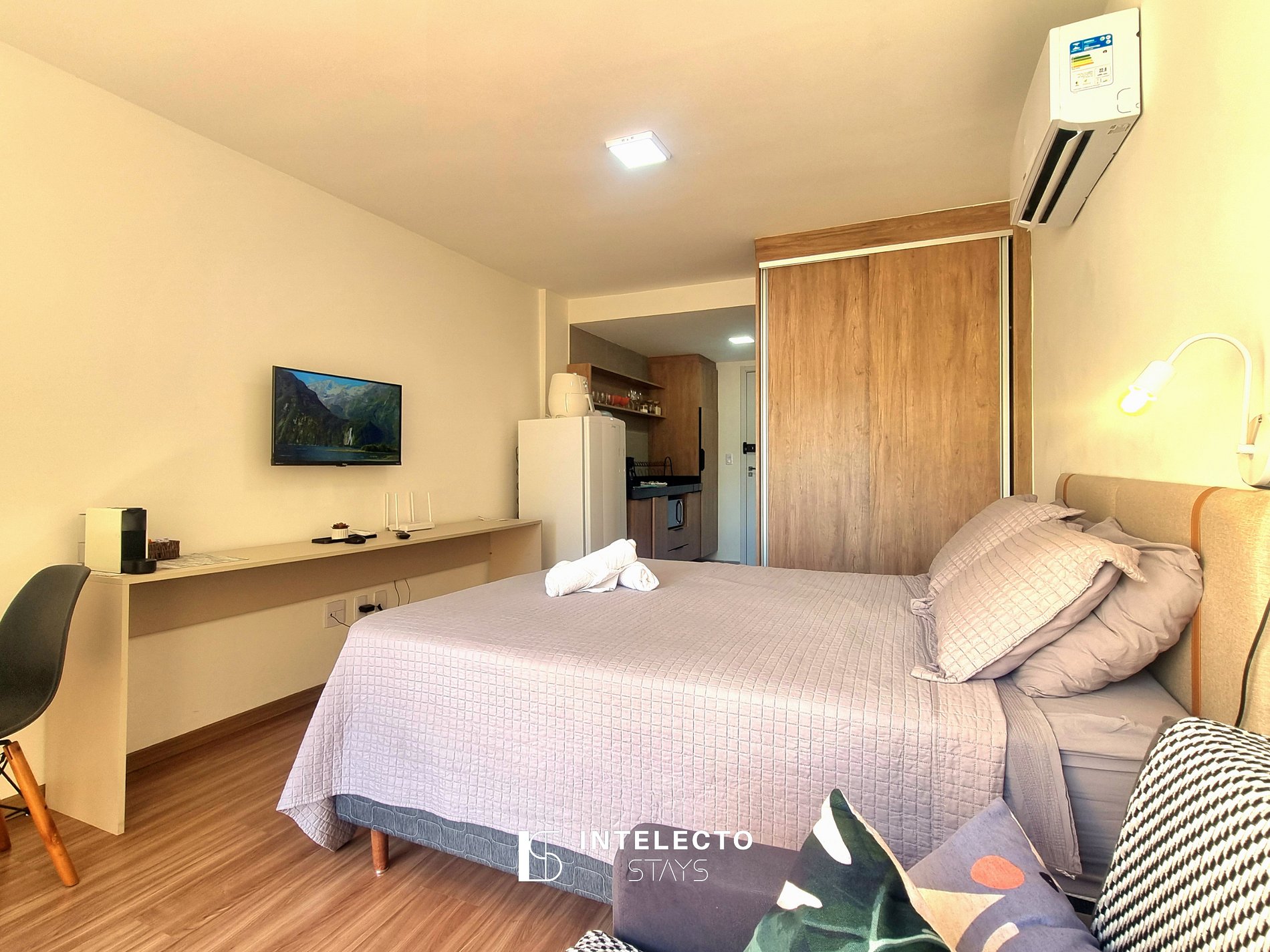 - Espaços integrados (quarto com cama queen e sala de estar com sofá-cama) com armários e guarda-roupas planejados