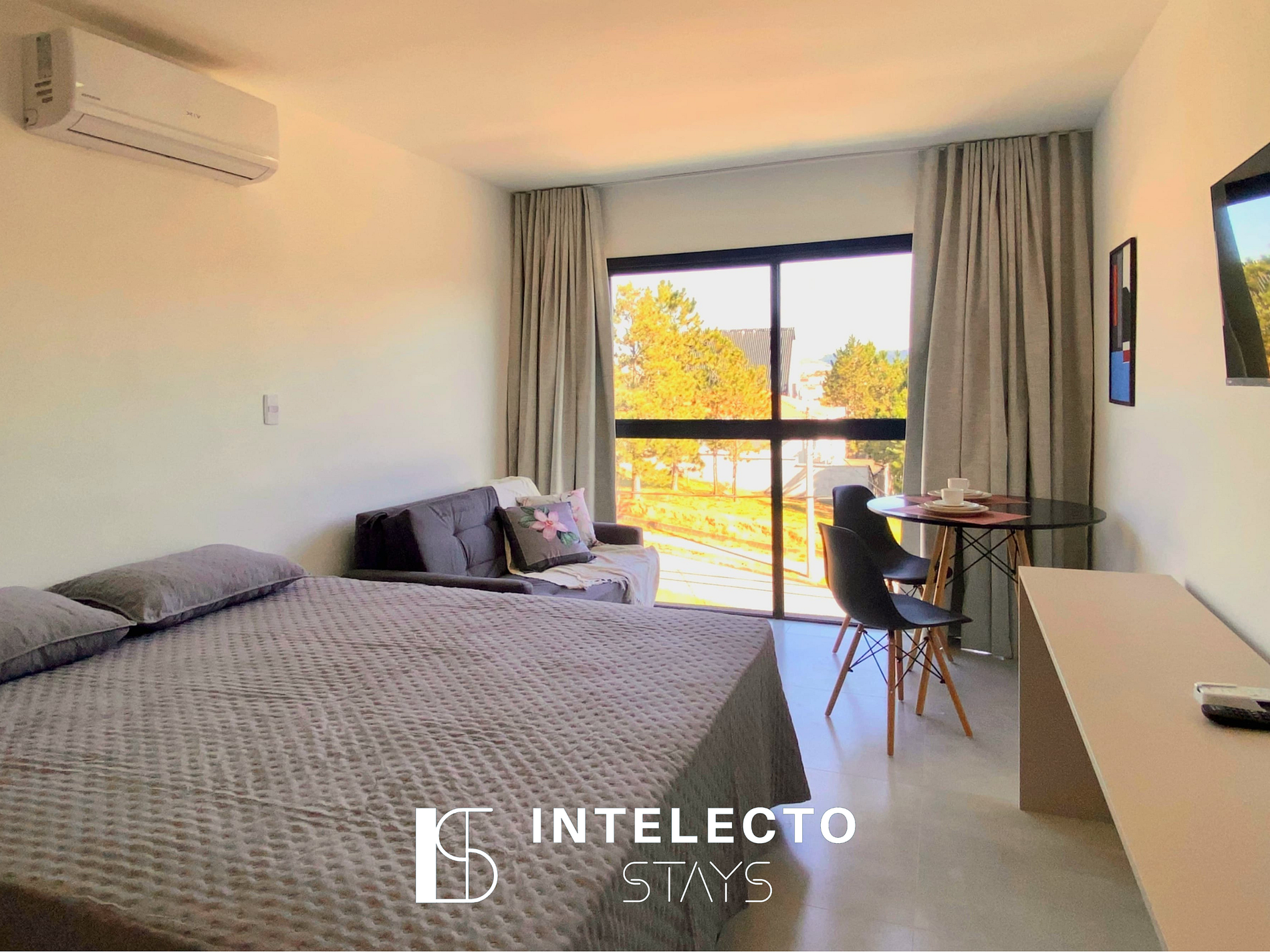 - Espaços integrados (quarto com cama queen e sofá-cama) com armários e guarda-roupas planejados