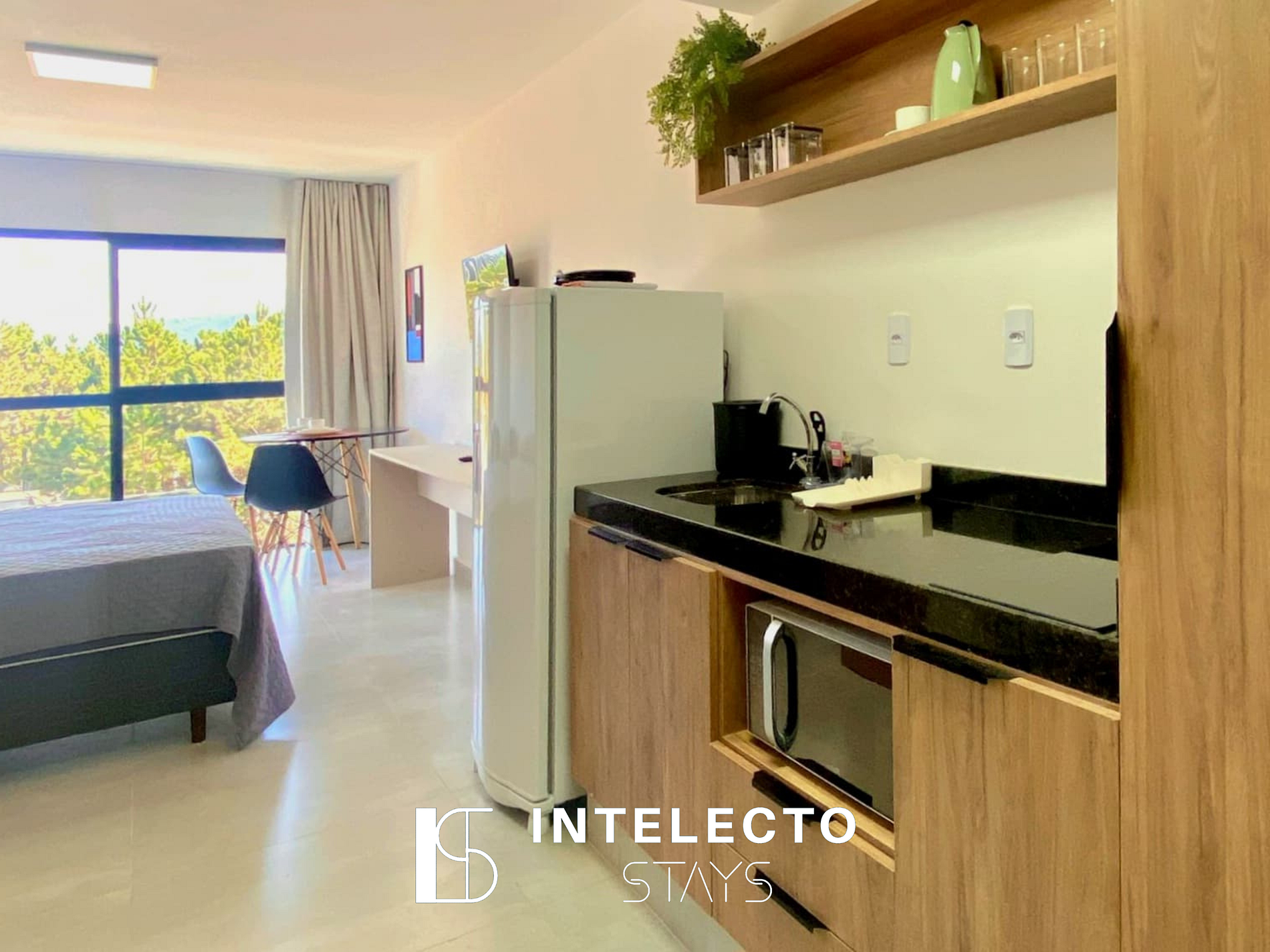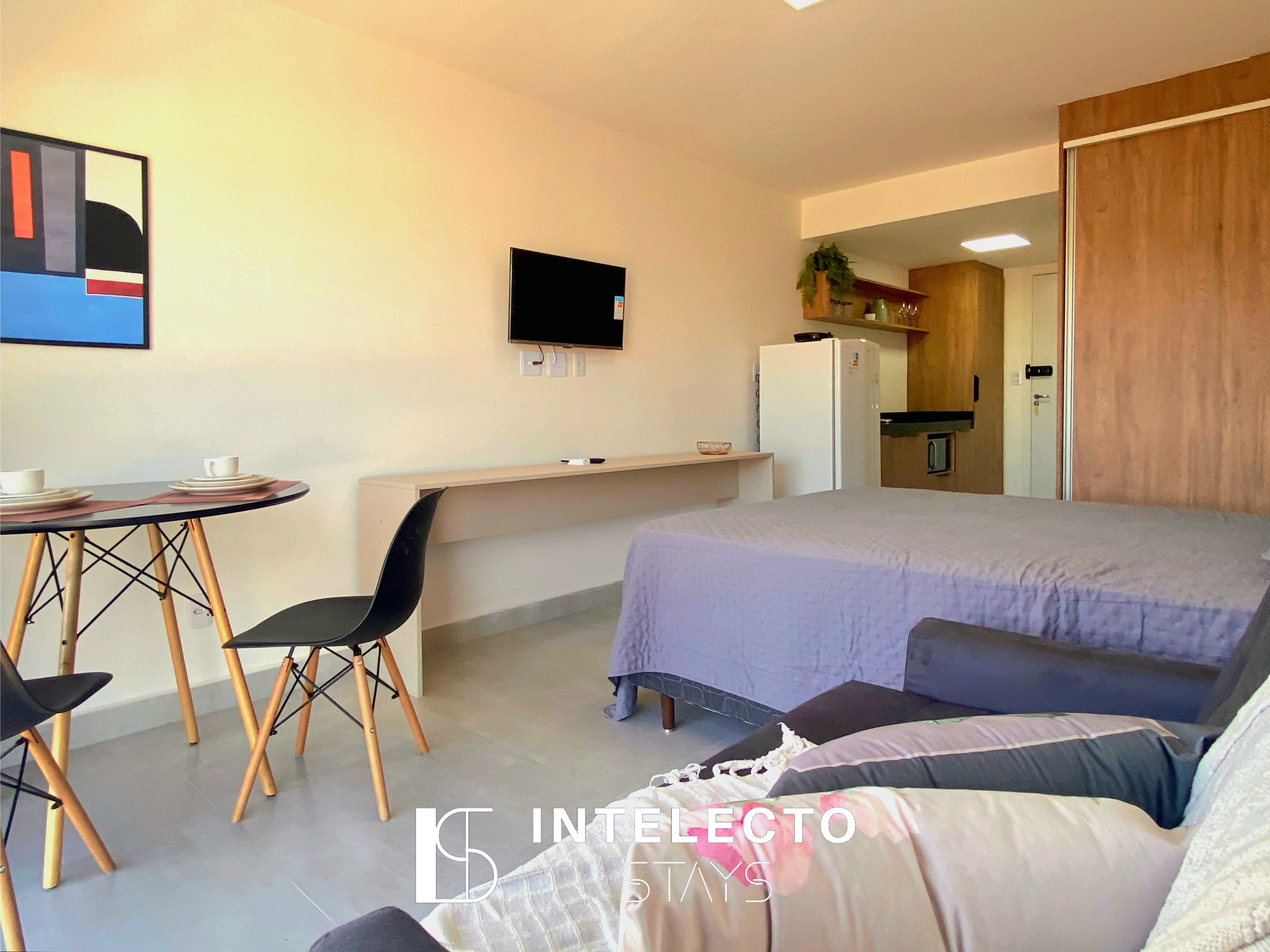 - Espaços integrados (quarto com cama queen e sofá-cama) com armários e guarda-roupas planejados