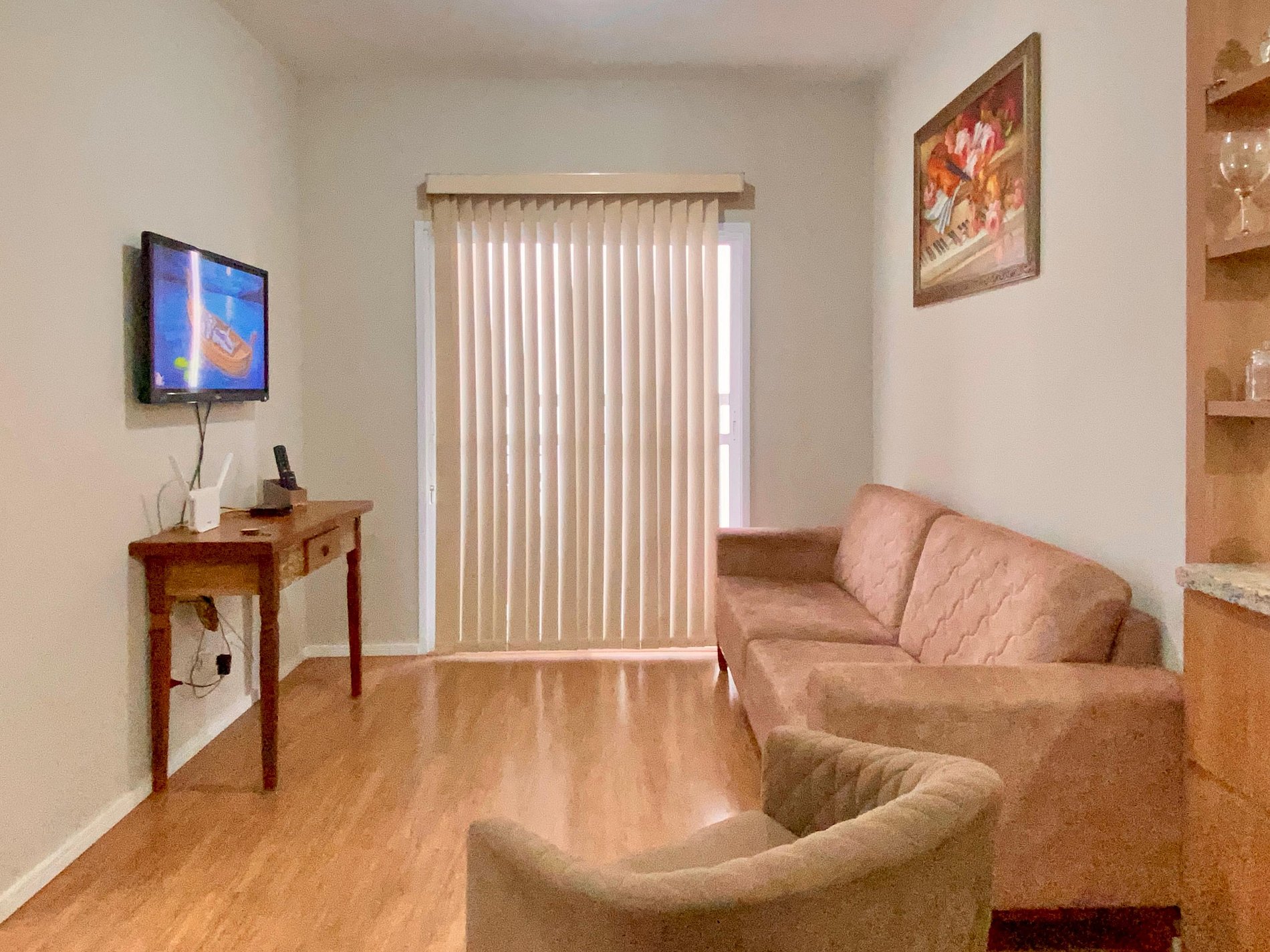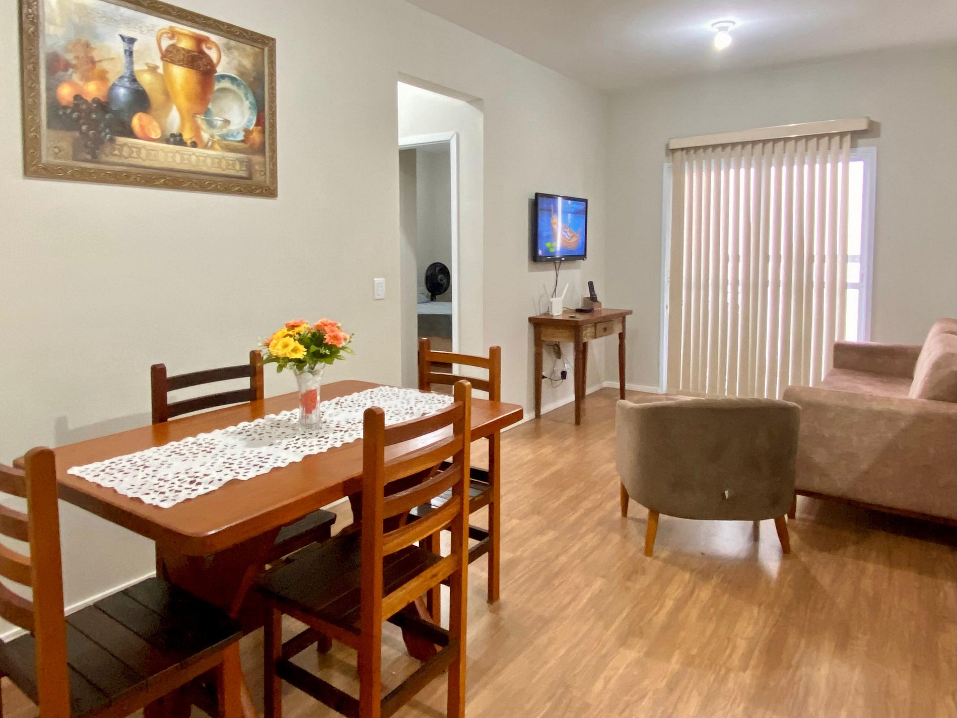 - Sala de dois ambientes com uma vista linda, mesa de 4 lugares, sofá-cama e Smart TV com streamings